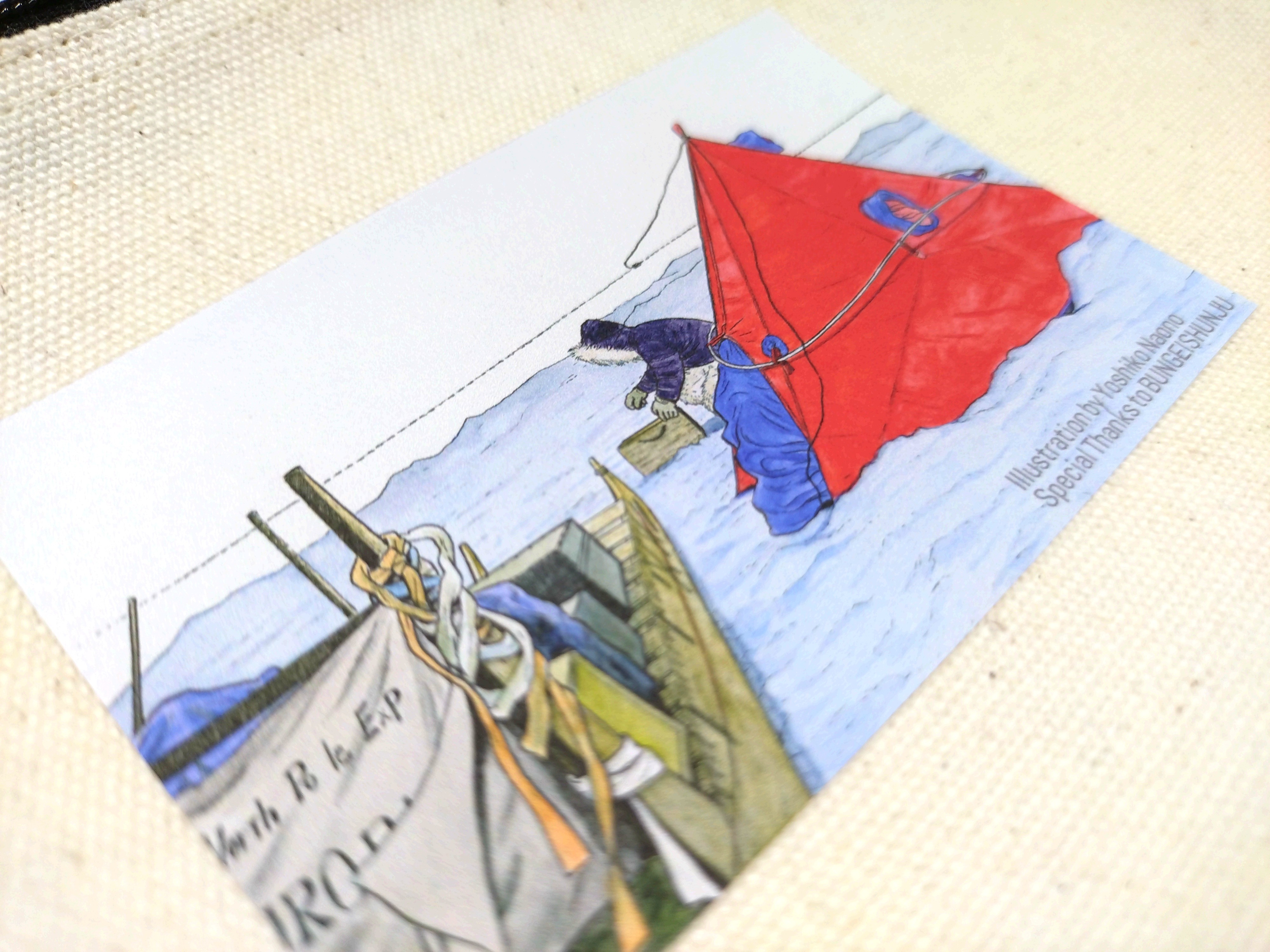 冒険を象徴する犬ぞりと四重張りのテントが目を引きます。また、黙々と準備している様子に植村さんらしさを感じるイラストです。